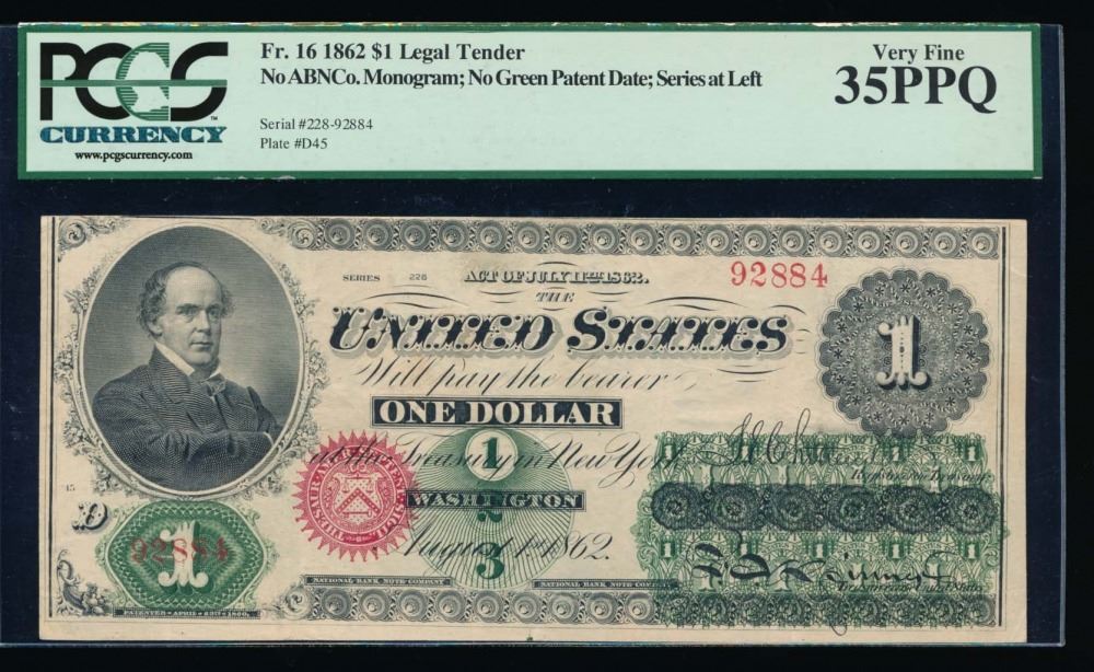 One 1862 $1 Legal Tender Note PCGS 35PPQ.