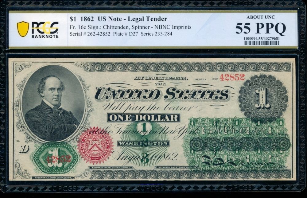 One 1862 $1 Legal Tender Note PCGS 55PPQ.