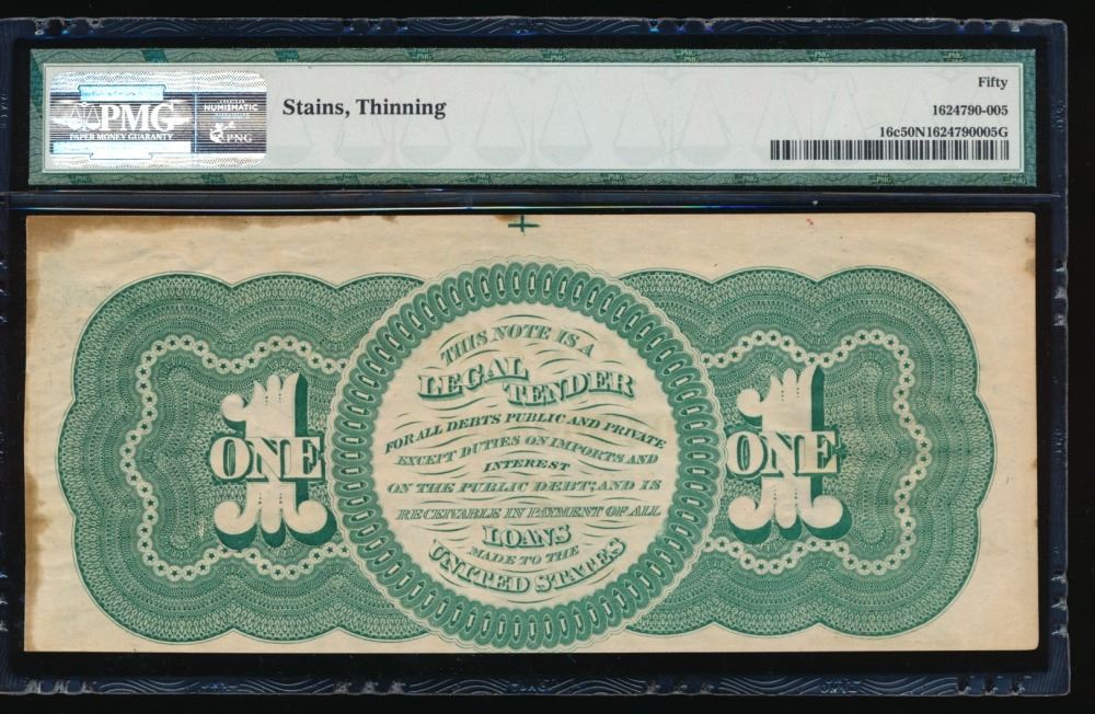 One 1862 $1 Legal Tender Note PMG 50NET.