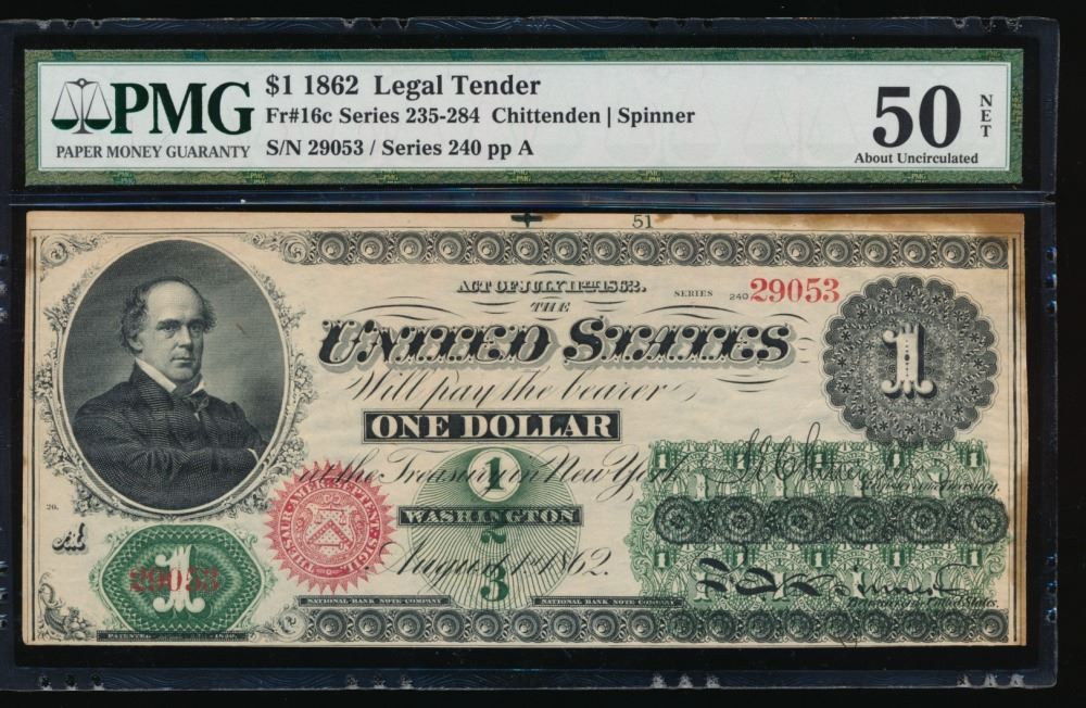 One 1862 $1 Legal Tender Note PMG 50NET.