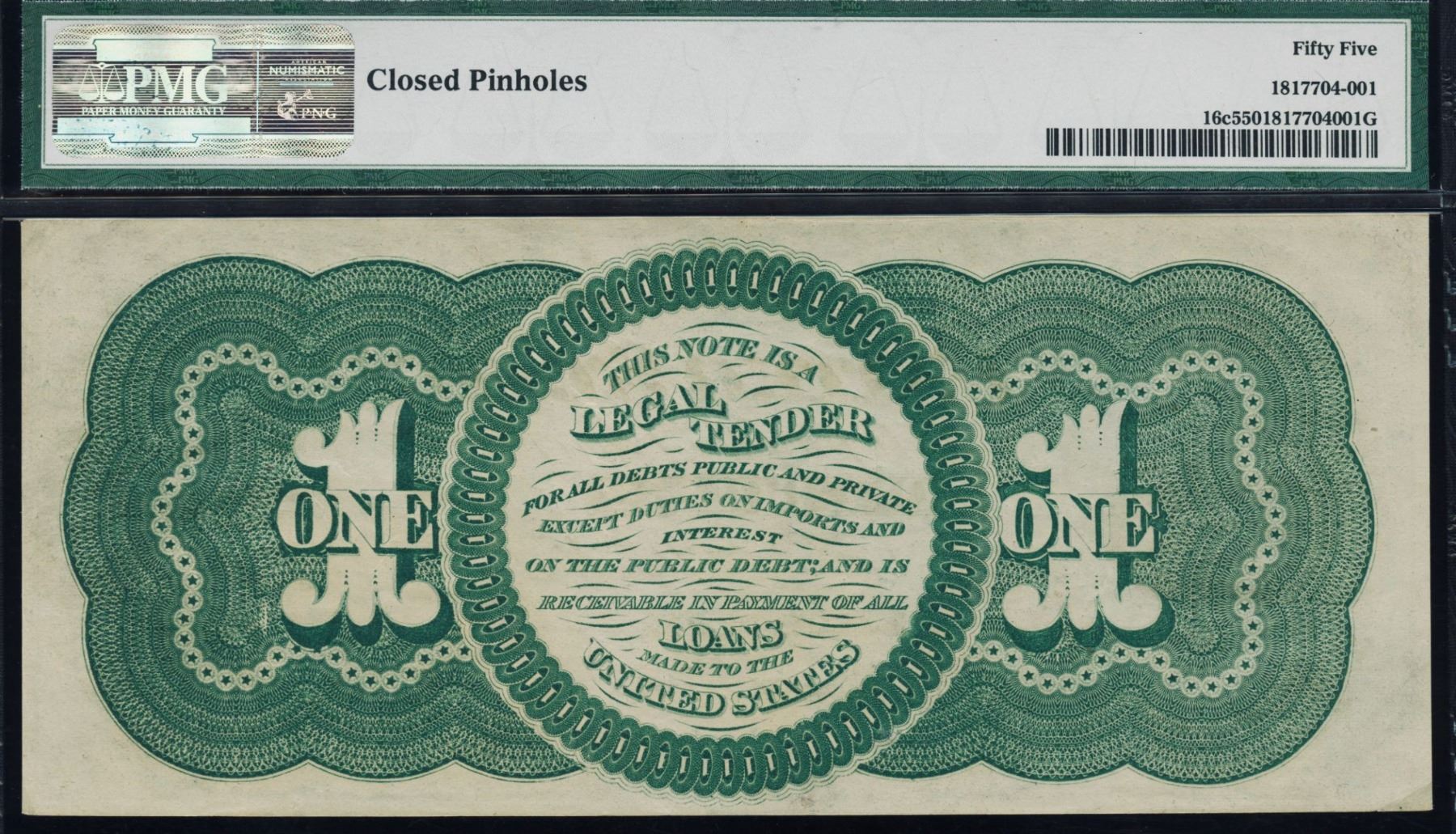 One 1862 $1 Legal Tender Note PMG 55.