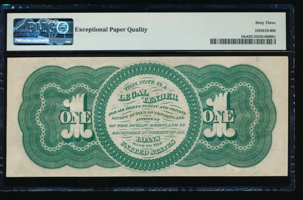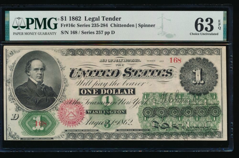 One 1862 $1 Legal Tender Note PMG 63EPQ.