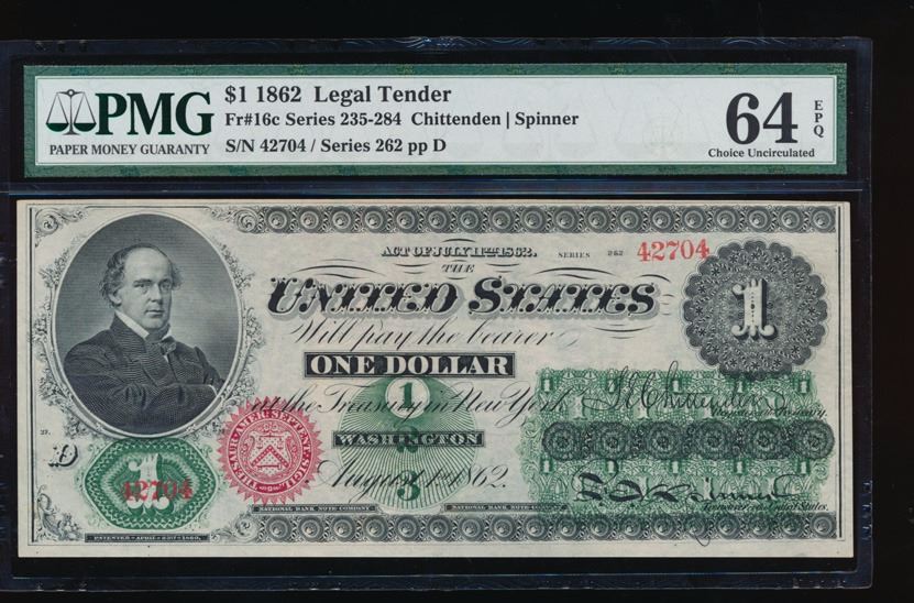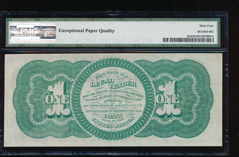 One 1862 $1 Legal Tender Note PMG 64EPQ.