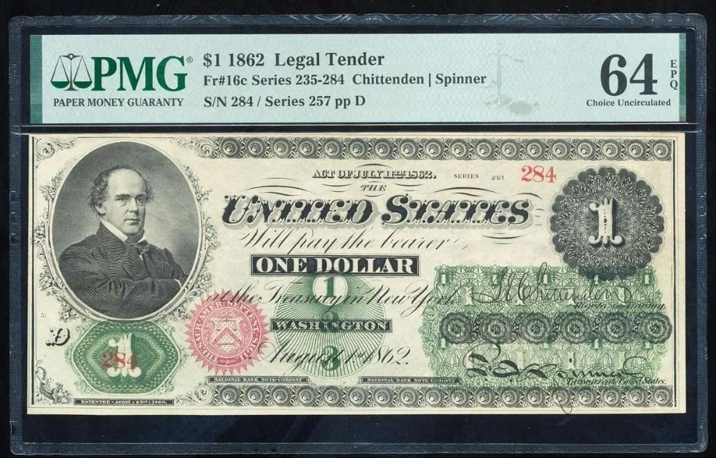 One 1862 $1 Legal Tender Note PMG 64EPQ.