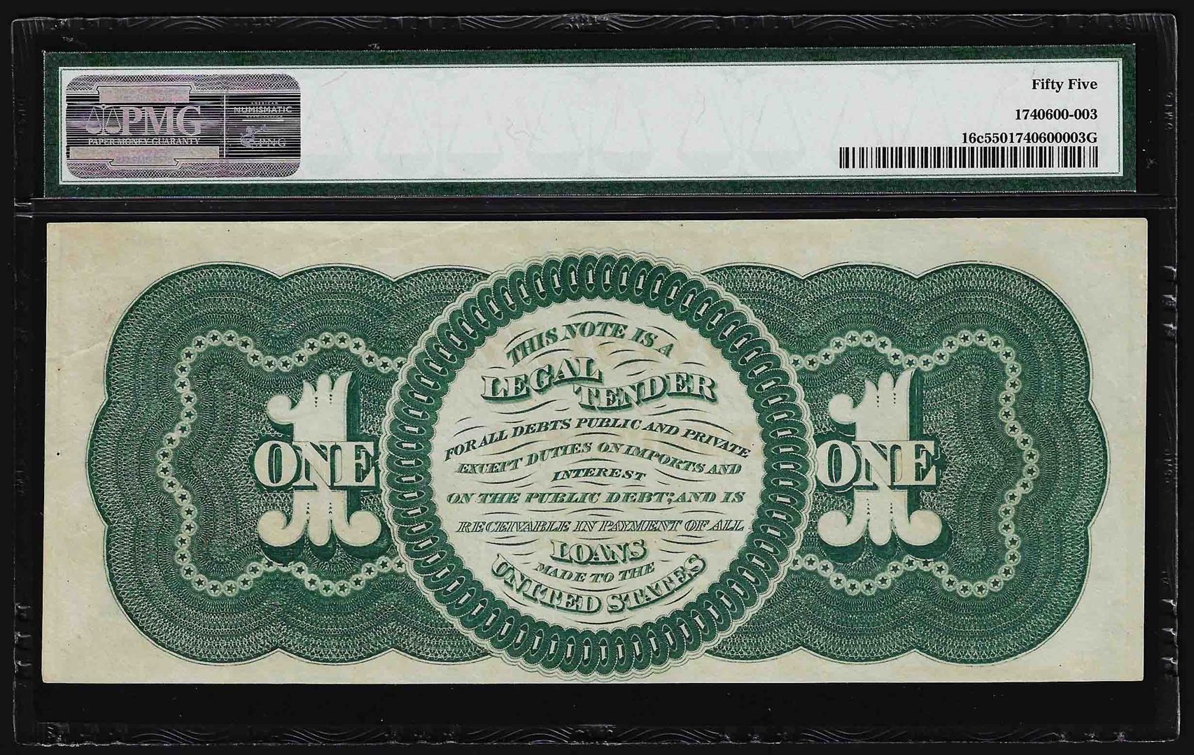 One 1862 $1 Legal Tender Note PMG About Uncirculated 55. PMG Certified.