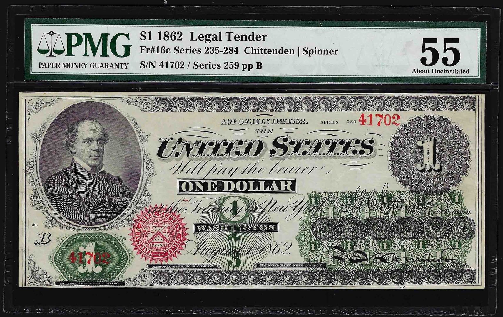One 1862 $1 Legal Tender Note PMG About Uncirculated 55. PMG Certified.