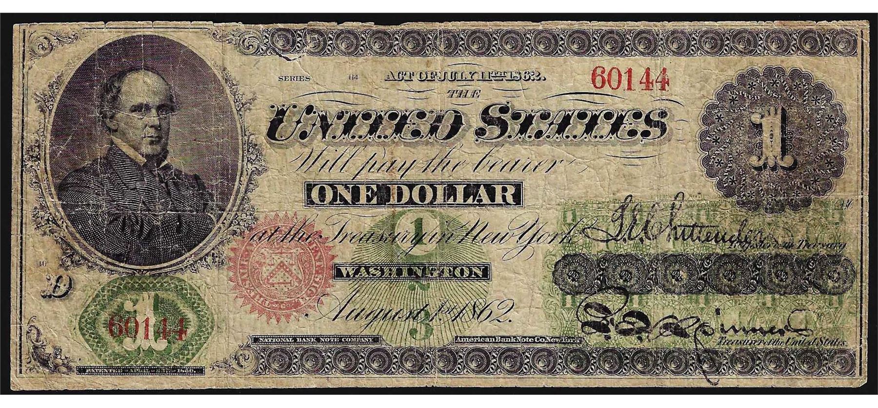One 1862 $1 Legal Tender Note. This note has some tape on the upper left center margin.