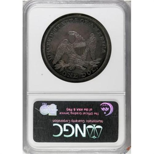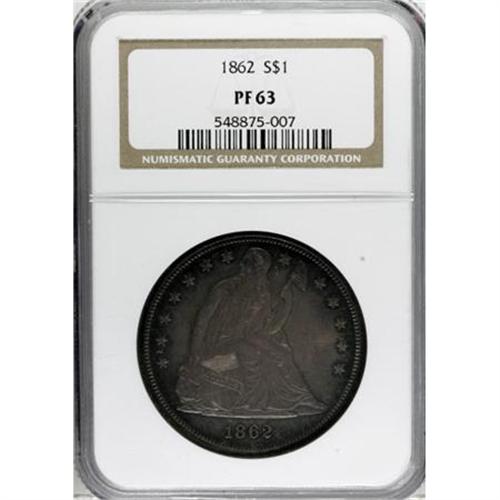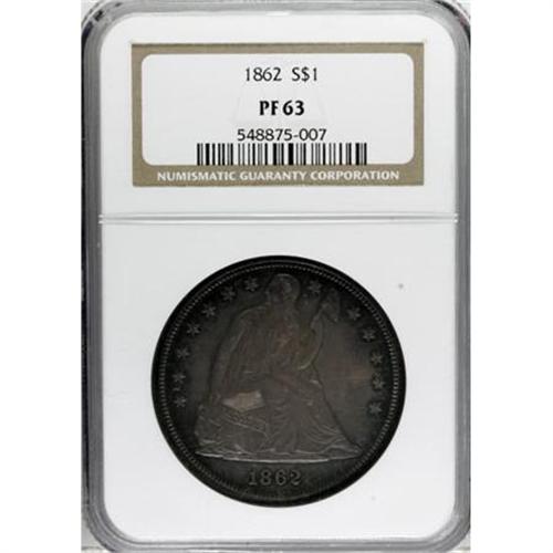 <B>1862 $1 PR63 NGC.</B></I> Medium intensity gray, cobalt-blue, and red-orange patination covers both faces of this Select proof, and excellent detail stands out on the design features. Close scrutiny with a glass reveals no unsightly marks. Proof dollars of 1862 are especially desired today because of the low business strike mintage of just 11,540 pieces.<BR><BR><b>Shipping:</b> Coins & Currency (<a target="_blank" href="http://www.heritageauctions.com/common/shipping.php">view shipping information</a>)