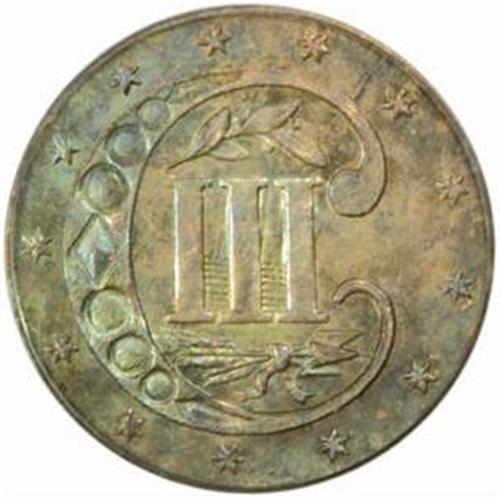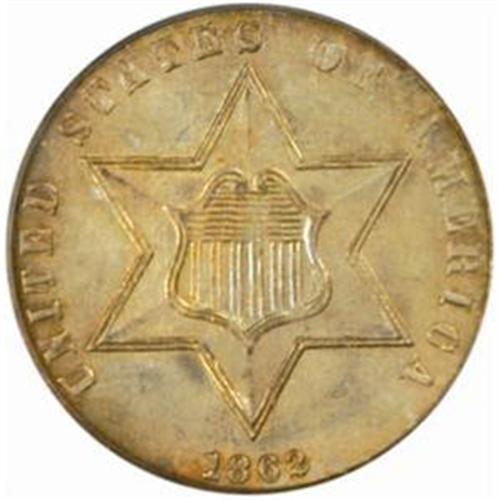 <style type="text/css"> body, td, th { font-family: Arial, Helvetica, sans-serif; font-size: 12px; color: #482424; margin: 0px; padding: 0px; } #header { background-image: url(http://www.bowersandmerena.com/ebay/images/template_v3_01.gif); clear: both; background-color: #590303; border-top-width: 2px; border-top-style: solid; border-top-color: #B38C4F;}#header #header_wrapper { height: 75px; clear: both; width: 800px; margin-right: auto; margin-left: auto; background-image: url(http://www.bowersandmerena.com/ebay/images/template_v3_03.gif); background-repeat: no-repeat; background-position: right; color: #F3EDCC;}#header #header_wrapper #header_logo { float: left; height: 75px; width: 444px; background-image: url(http://www.bowersandmerena.com/ebay/images/template_v3_02.gif); background-repeat: no-repeat; font-size: 10px; text-transform: capitalize; color: #B38C4F;}#header #header_wrapper #header_right { float: left; height: 75px; width: 356px; text-align: right;}#header #header_wrapper #header_right #headerLoginBtn { margin-bottom: 30px;}#header #header_wrapper #header_right input#txtSearch { color: #B49056; border: 1px solid #B49056; width: 175px; padding-top: 3px; padding-right: 3px; padding-bottom: 4px; padding-left: 3px;}#nav { height: 37px; background-image: url(http://www.bowersandmerena.com/ebay/images/template_v3_05.gif); clear: both;}#nav #nav_wrapper { height: 35px; width: 800px; margin-right: auto; margin-left: auto; border-left-width: 1px; border-left-style: solid; border-left-color: #B38C4F;}#nav #nav_wrapper a { padding-right: 15px; padding-left: 15px; border-right-width: 1px; border-right-style: solid; border-right-color: #B38C4F; height: 25px; padding-top: 10px; display: block; float: left; text-decoration: none; font-weight: bold; color: #5D0303;}#nav #nav_wrapper a:hover { color: #B38C4F;}#nav #nav_wrapper #search { float: right; padding-top: 7px;}#nav #nav_wrapper #search #txtSearch { font-family: Arial, Helvetica, sans-serif; font-size: 10px; text-transform: uppercase; color: #D2AE75; border: 1px solid #B38C4F; padding: 3px;}#content_bgd { background-image: url(http://www.bowersandmerena.com/ebay/images/template_v3_09.gif); background-repeat: repeat-y; background-position: center; padding-top: 15px; padding-bottom: 15px; background-color: #FBFBDB;}#content_wrapper { clear: both; height: auto; width: 800px; margin-right: auto; margin-left: auto;}.LotDetailWhite{ line-height:normal; font-size:13px; font-family: arial,helvetica,sans-serif; color: White; font-weight: bold;}.LotDetailInformation{ line-height:normal; font-size: 13px; font-family: arial,helvetica,sans-serif;}.LotDetailMessage{ line-height:normal; font-size: 13px; font-family: arial,helvetica,sans-serif; color: red;}}tr.HeaderAuctionTitle td { color: #000000; font-weight: bold; padding: 2px; background-image: url(http://www.bowersandmerena.com/ebay/images/template_v3_05.gif); background-repeat: repeat-x; border-bottom-width: 1px; border-bottom-style: solid; border-bottom-color: #B38C4F;}table.AuctionSummary a, table.AuctionSummary a:link, table.AuctionSummary a:visited { color: #0000FF; text-decoration: none;}}td.tableHeaderLeft { border-left-width: 1px; border-left-style: solid; border-left-color: #B38C4F;}td.tableHeaderRight { border-right-width: 1px; border-right-style: solid; border-right-color: #B38C4F;}td.tableCellMiddle { border-left-width: 1px; border-left-style: solid; border-left-color: #B38C4F; border-right-width: 1px; border-right-style: solid; border-right-color: #B38C4F; padding: 5px;}tr.footer td { border-top-width: 1px; border-top-style: solid; border-top-color: #B38C4F;}</style></head><body><div id="header"> <div id="header_wrapper"> <div id="header_logo"> </div> <div id="header_right"> </div> </div></div><div id="nav"> <div id="nav_wrapper"> <a href="http://www.bowersandmerena.com">Our eBayLive Auctions</a> <a href="#PaymentInfo">Payment Information</a> <a href="#ShippingInfo">Shipping Information</a> <a href="#About">About Bowers and Merena</a> </div></div><div id="content_bgd"> <div id="content_wrapper"> <table width="100%" border="0" cellpadding="5" cellspacing="0" class="AuctionSummary"> <tbody> <tr class="HeaderAuctionTitle" style="height: 25px;"> <td align="left" class="tableHeaderLeft" > </td> <td align="center" class="tableHeaderRight"> <span style="font-size: large;">Lot #345. 1862/1 Silver Three-Cent Piece. FS-007. MS-65 (PCGS).</span> </td> </tr> <tr> <td colspan="3" class="tableCellMiddle"> Relatively light silver-apricot patina evenly blankets the obverse, but the reverse exhibits richer, well-blended shades of cobalt-blue and lavender-gray colors. Fairly bold clashmarks (as struck) are present around the central design elements, but there are no abrasions or other grade-limiting blemishes. This overdate was created out of the Mint's desire to reuse an older die that was still in working order rather that simply consigning it to the scrape pile.
