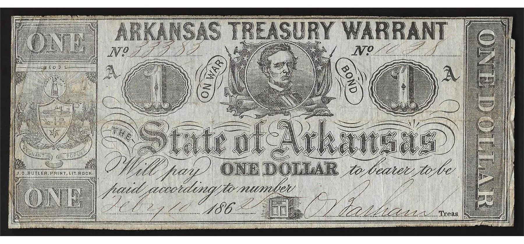 One 1862 $1 State of Arkansas Treasury Warrant Note.