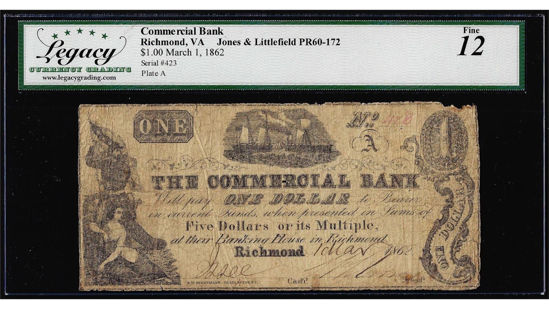 One 1862 $1 The Commercial Bank Richmond, VA Obsolete Note Legacy Fine 12. Legacy Graded.