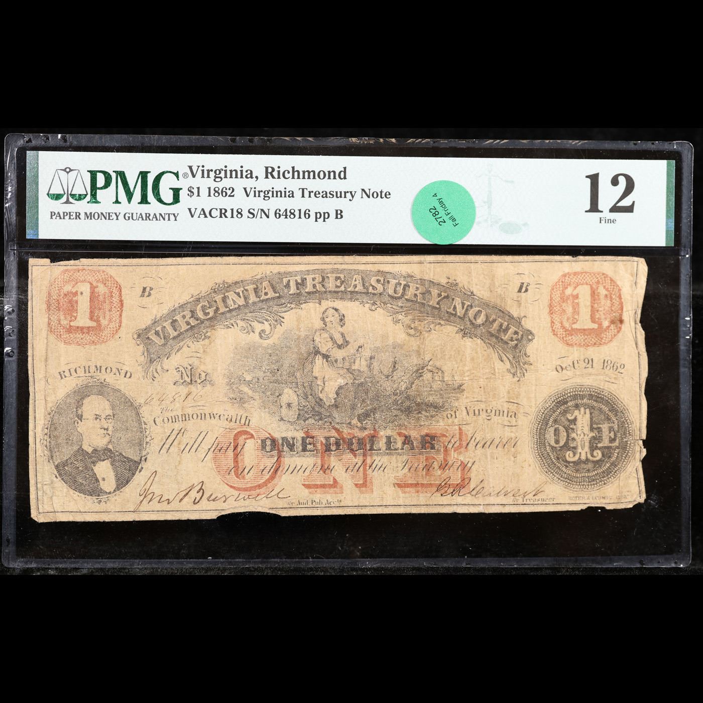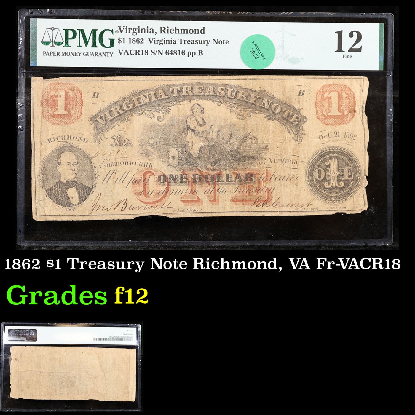 1862 $1 Treasury Note Richmond, VA Fr-VACR18 Graded f12 By PMG