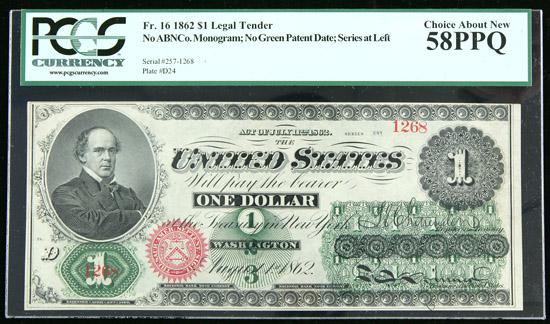 1862, $1 United States Note. PCGS Choice About New 58PPQ. . Fr-16. A trivial corner fold appears to be the only grade limiting factor on this boldly embossed, fully original example.