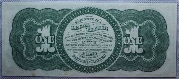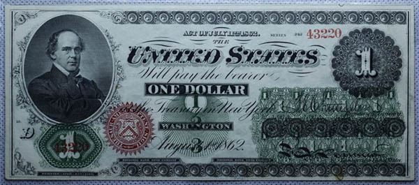 1862, 1 United States Note. S/N 43220 pp D. Series 235-284, Chittenden / Spinner. Minor stains. PMG graded About Uncirculated 55.