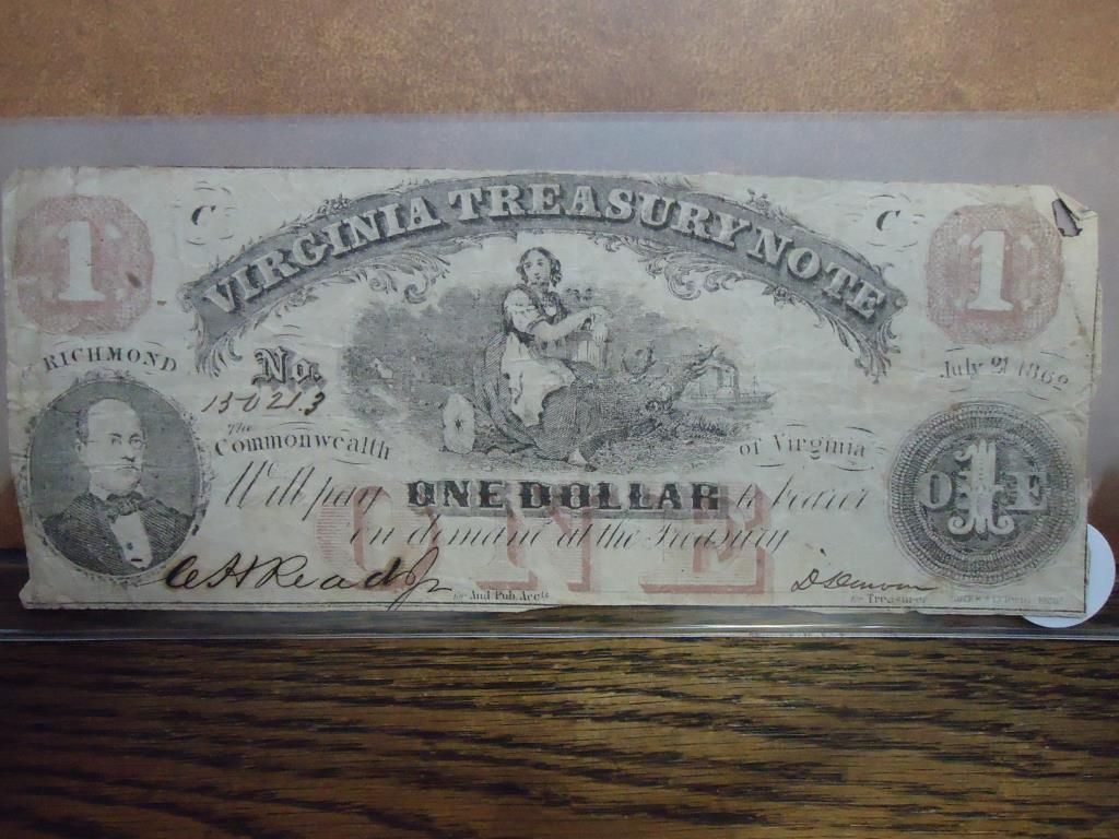 1862 $1 VIRGINIA TREASURY NOTE HAND SIGNED & #'ED