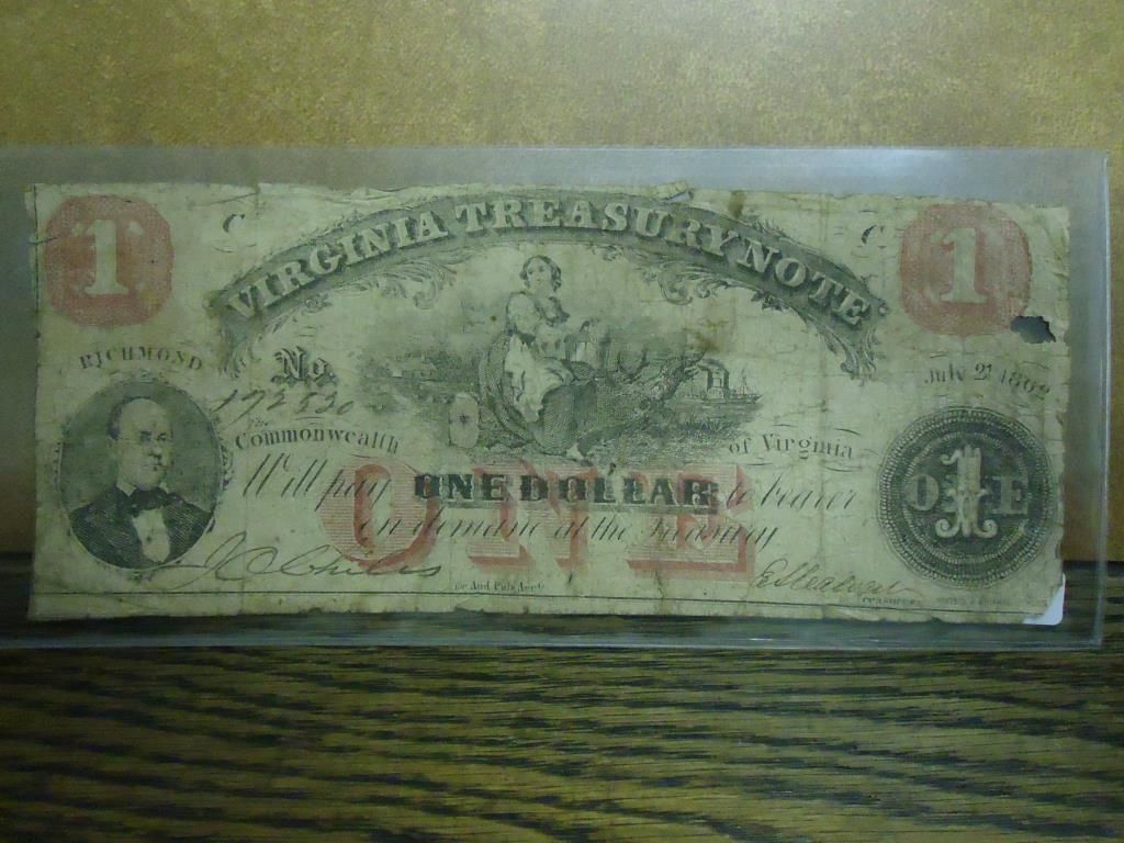 1862 $1 VIRGINIA TREASURY NOTE HAND SIGNED & #'ED