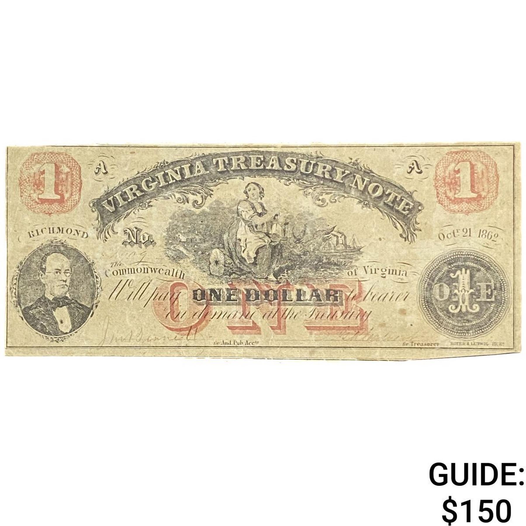 1862 $1 Virginia Treasury Note Obsolete Richmond