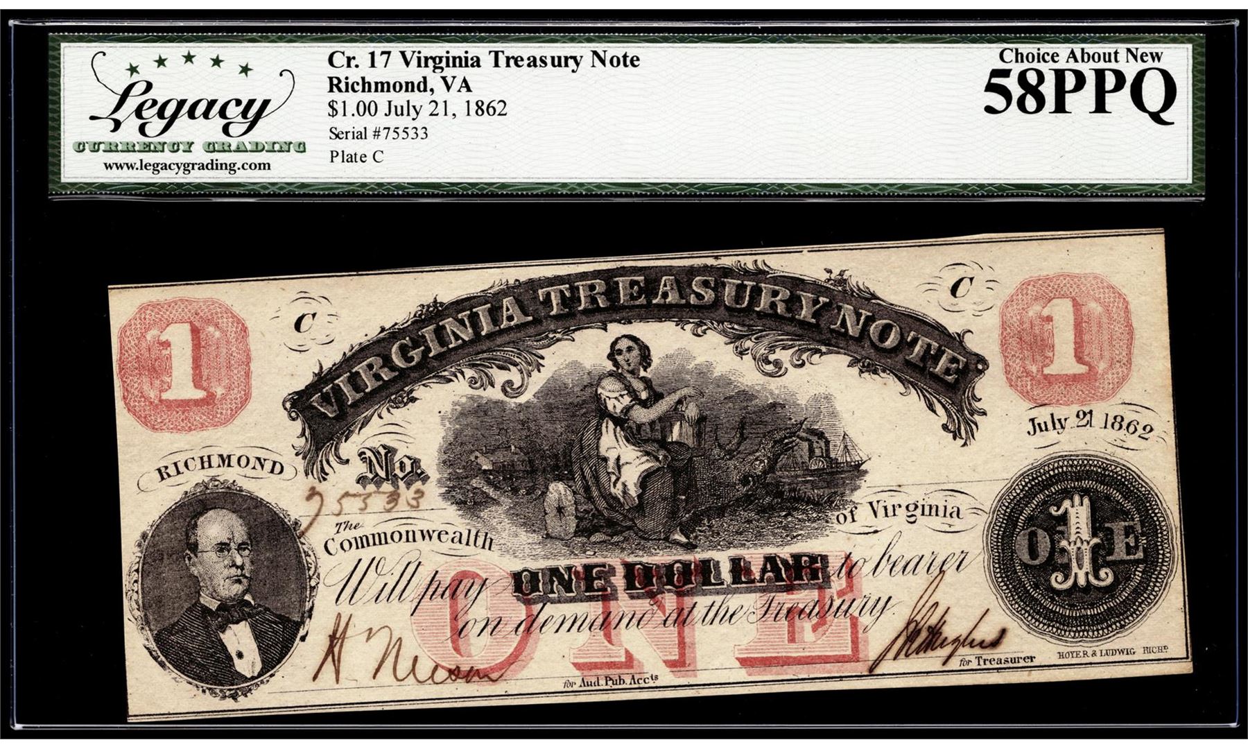 One 1862 $1 Virginia Treasury Note Richmond VA Obsolete Note Legacy Choice About New 58PPQ. Legacy Graded.