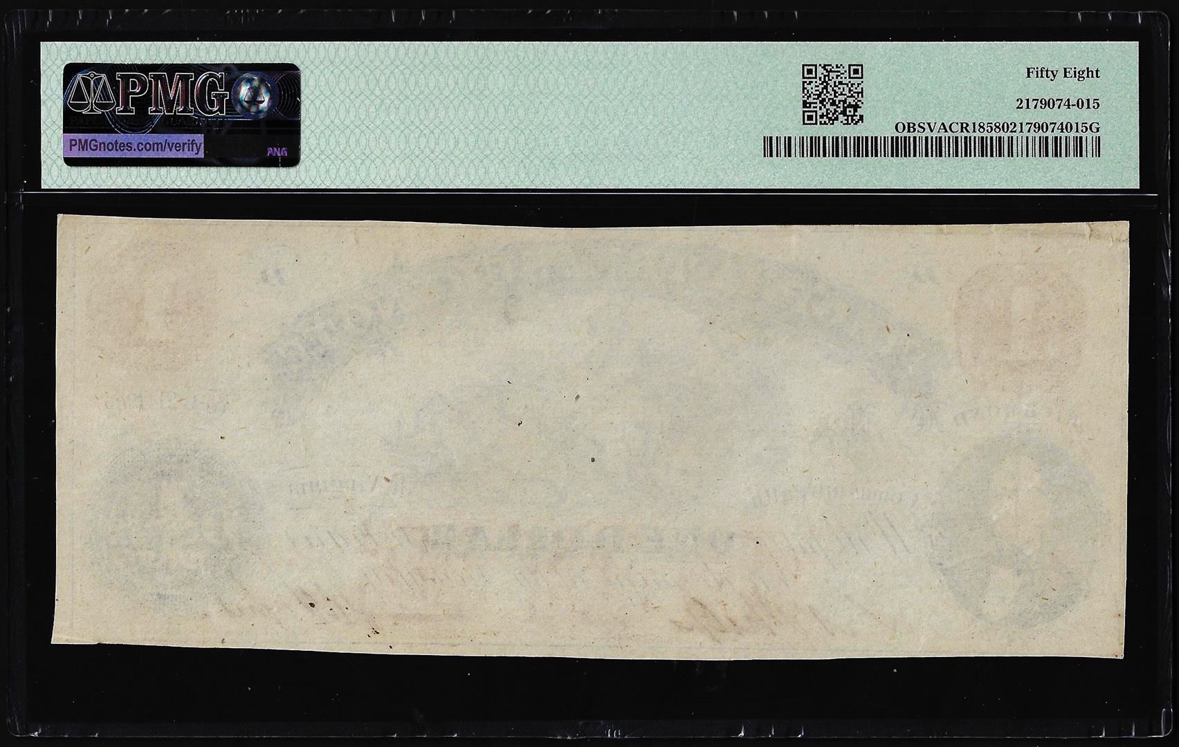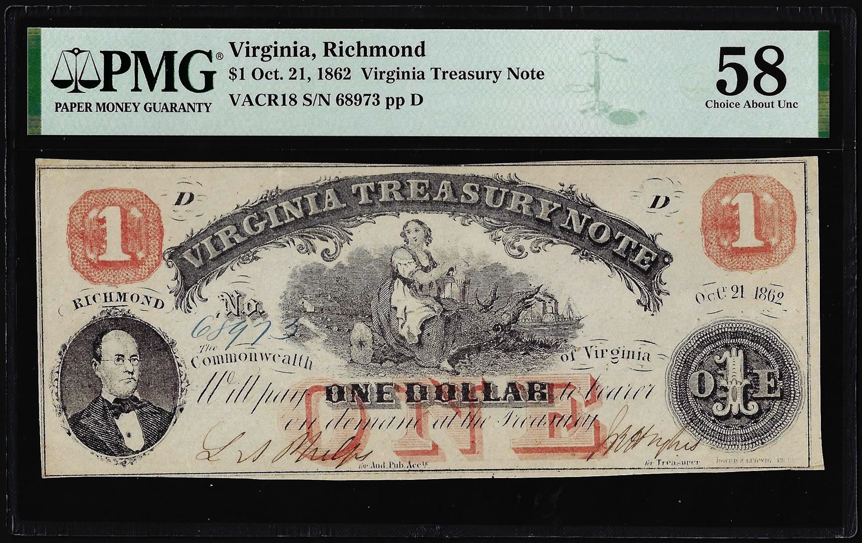 One 1862 $1 Virginia Treasury Obsolete Note VACR18 PMG Choice About Uncirculated 58. PMG Certified.