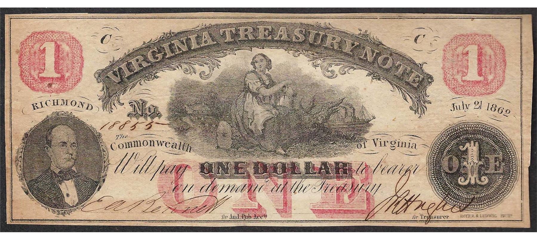 One 1862 $1 Virginia Treasury Obsolete Note.