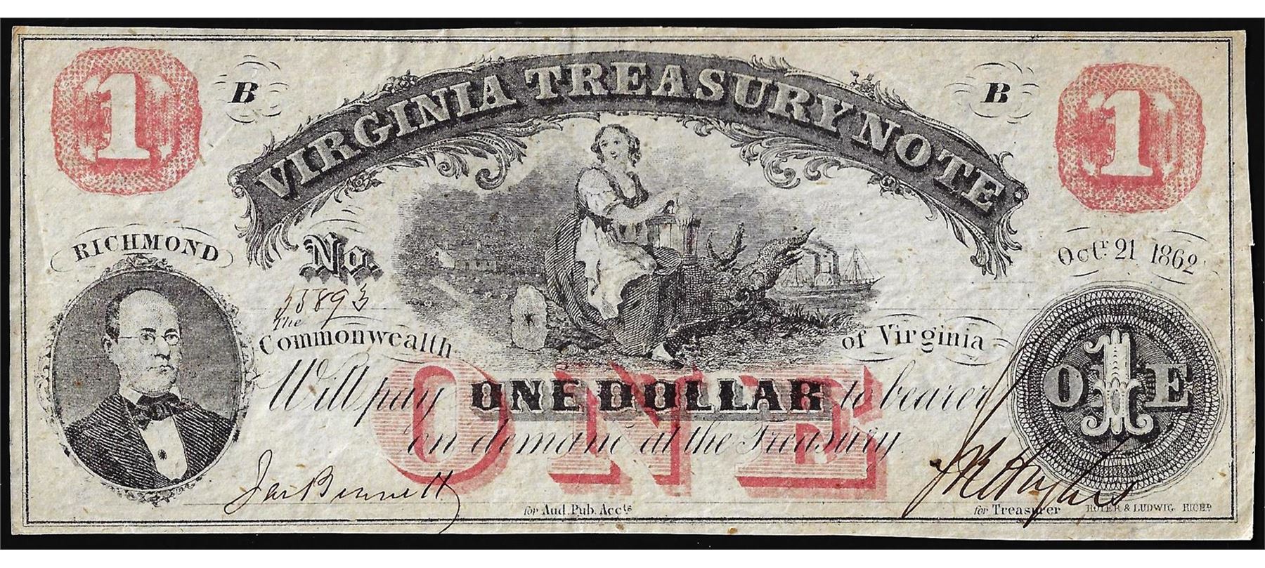 One 1862 $1 Virginia Treasury Obsolete Note.