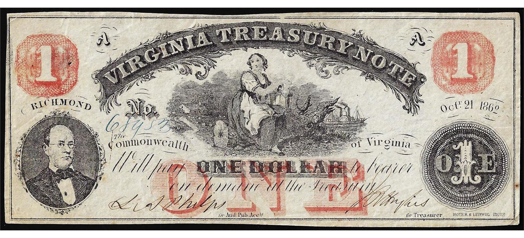 One 1862 $1 Virginia Treasury Obsolete Note.