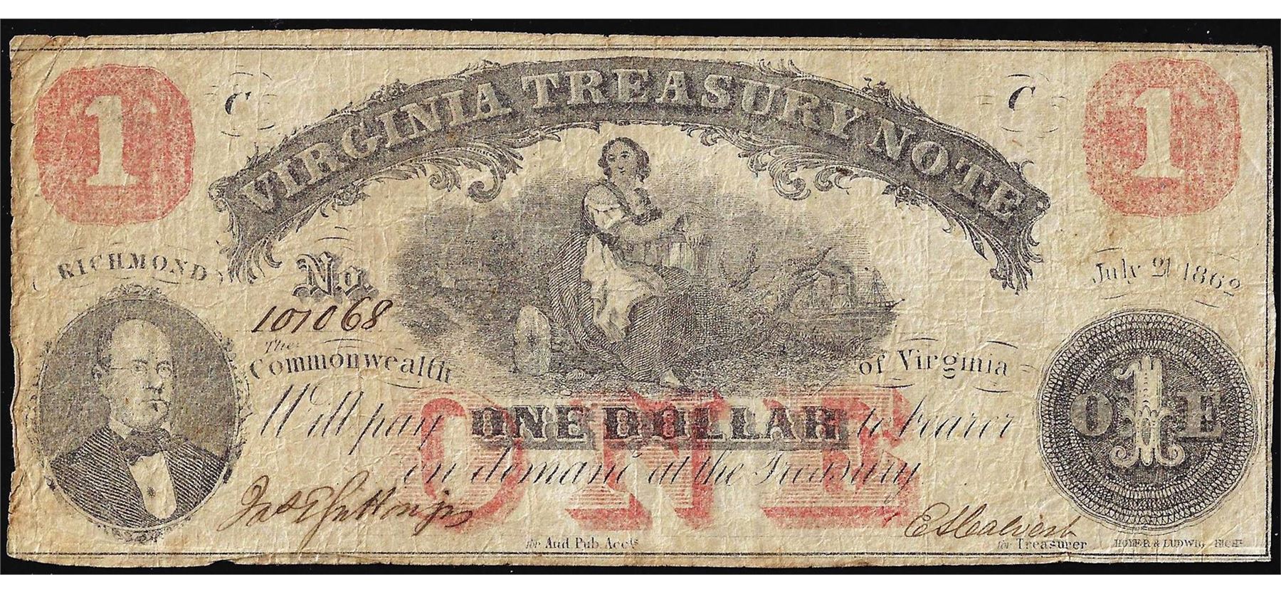 One 1862 $1 Virginia Treasury Richmond, VA Obsolete Note.