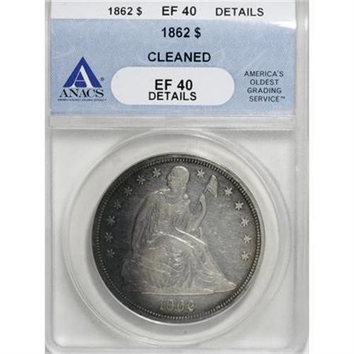 <B>1862 $1 --Cleaned--ANACS. XF40 Details.</B></I> Silver dollars were hoarded by 1862, but the mintage of 11,540 pieces was still uncommonly low for a Philadelphia issue. Few were saved, since the nation had greater concerns during the Civil War. Lustrous for an XF, but slightly glossy and typically abraded. The left obverse border has forest-green toning.<BR><BR><B>Coin Engraver:</B> Christian Gobrecht<BR><BR><b>Shipping:</b> Coins & Currency (<a target="_blank" href="http://www.heritageauctions.com/common/shipping.php">view shipping information</a>)