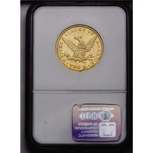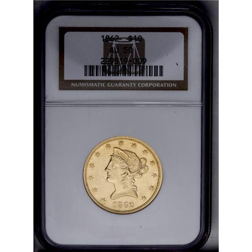 <B>1862<$10> AU50 NGC.</B></I> Lustrous and bold for the assigned date. The cheek displays small marks, and a pair of scratches resides on the upper reverse field. The reverse has a small rim ding at 4:30. An underappreciated and low mintage issue.
