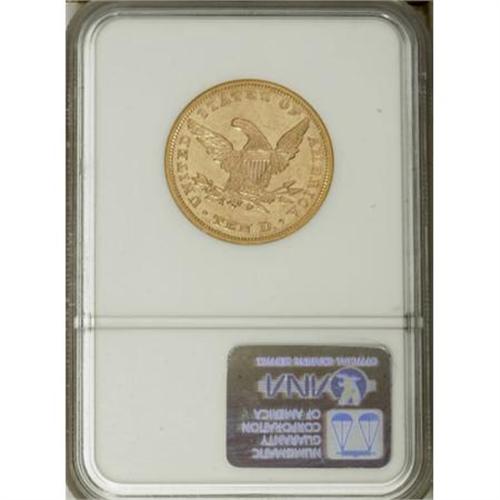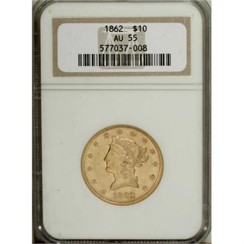 <B>1862 $10 AU55 NGC.</B></I> This low mintage Civil War eagle is a bit scarcer than the '57-O twenty, yet it trades for one-third the price. Substantial bright luster remains. Liberty's cheek is abraded. Census: 14 in 55, 17 finer (8/07).<BR><BR><B>Coin Engraver:</B> Christian Gobrecht<BR><BR><b>Shipping:</b> Coins & Currency (<a target="_blank" href="http://www.heritageauctions.com/common/shipping.php">view shipping information</a>)
