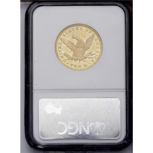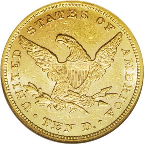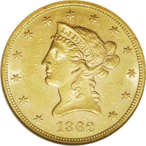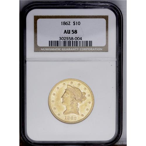<B>1862 $10 AU58 NGC.</B></I> A very scarce date that is seldom found in any grade, and this near-Mint Condition coin will certainly attract considerable attention. Moderate handling marks on the surfaces, including a minor cut above the 62, another on Liberty's lower neck. Traces of prooflike fields can be seen near the devices. The paltry mintage of 10,995 pieces suffered the usual meltings and losses leaving just a handful for collectors in all grades. This is certainly one of the finer examples to survive. Census: 13 in 58, 3 finer (1/06).