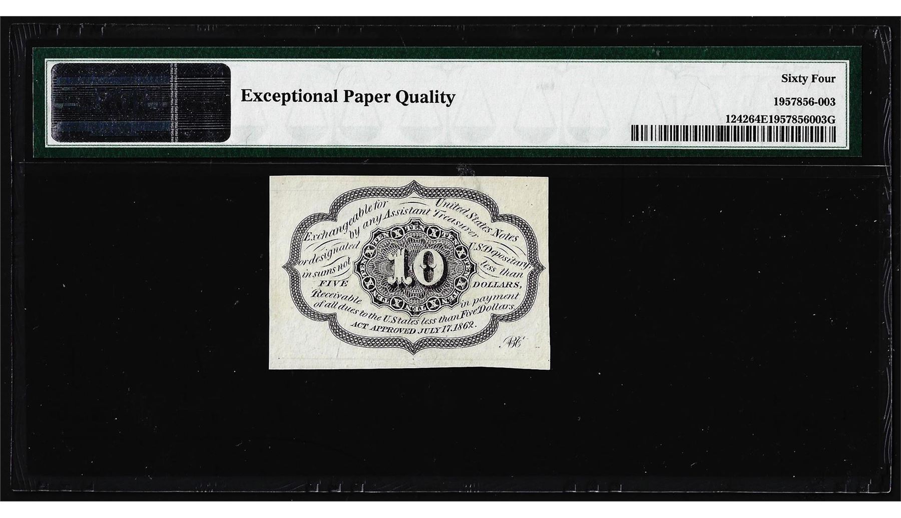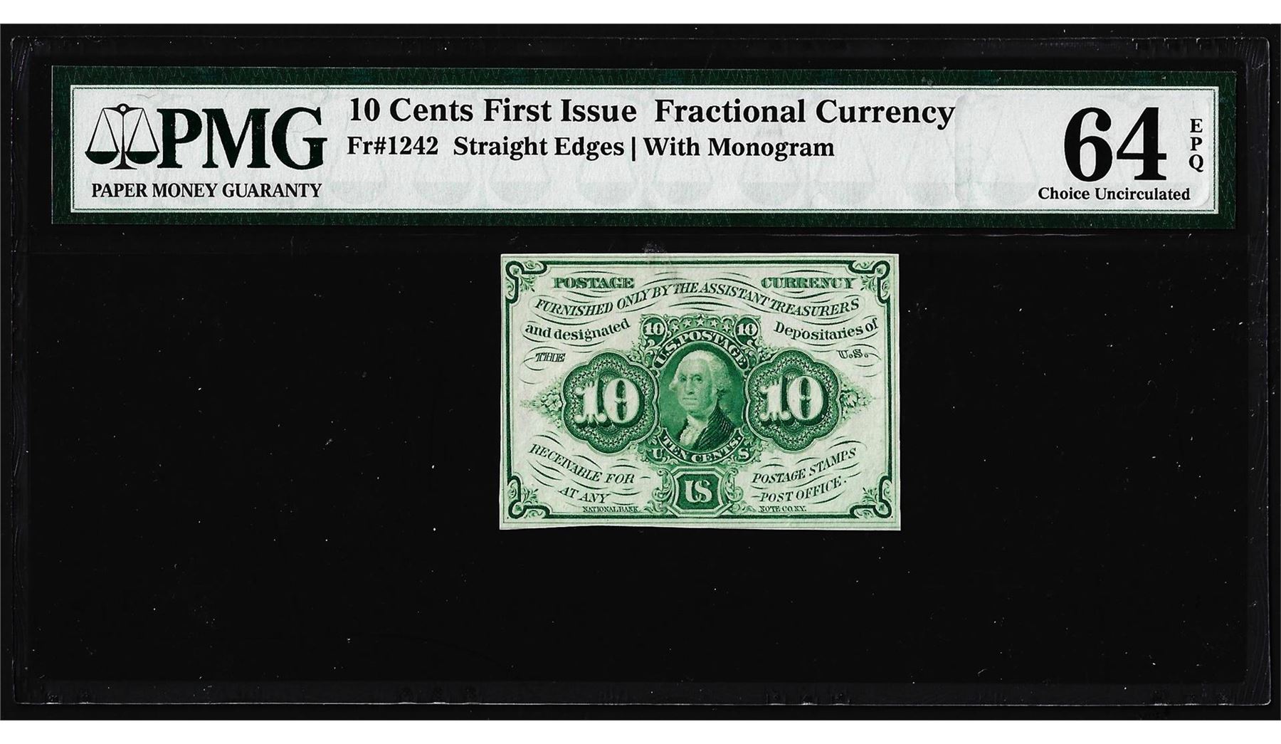 One 1862 10 Cent First Issue Fractional Currency Note Fr.1242 PMG Choice Uncirculated 64EPQ. PMG Certified.