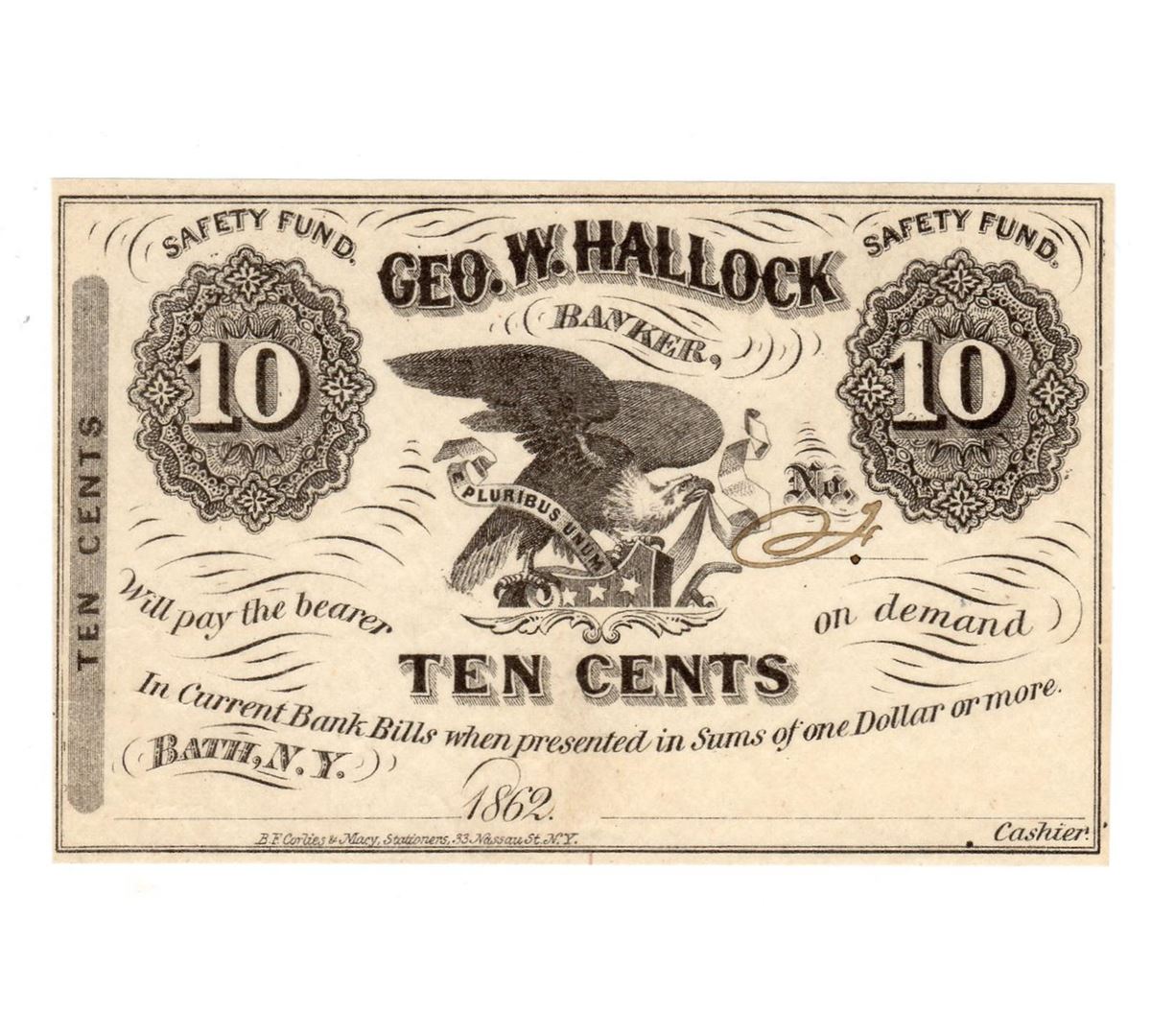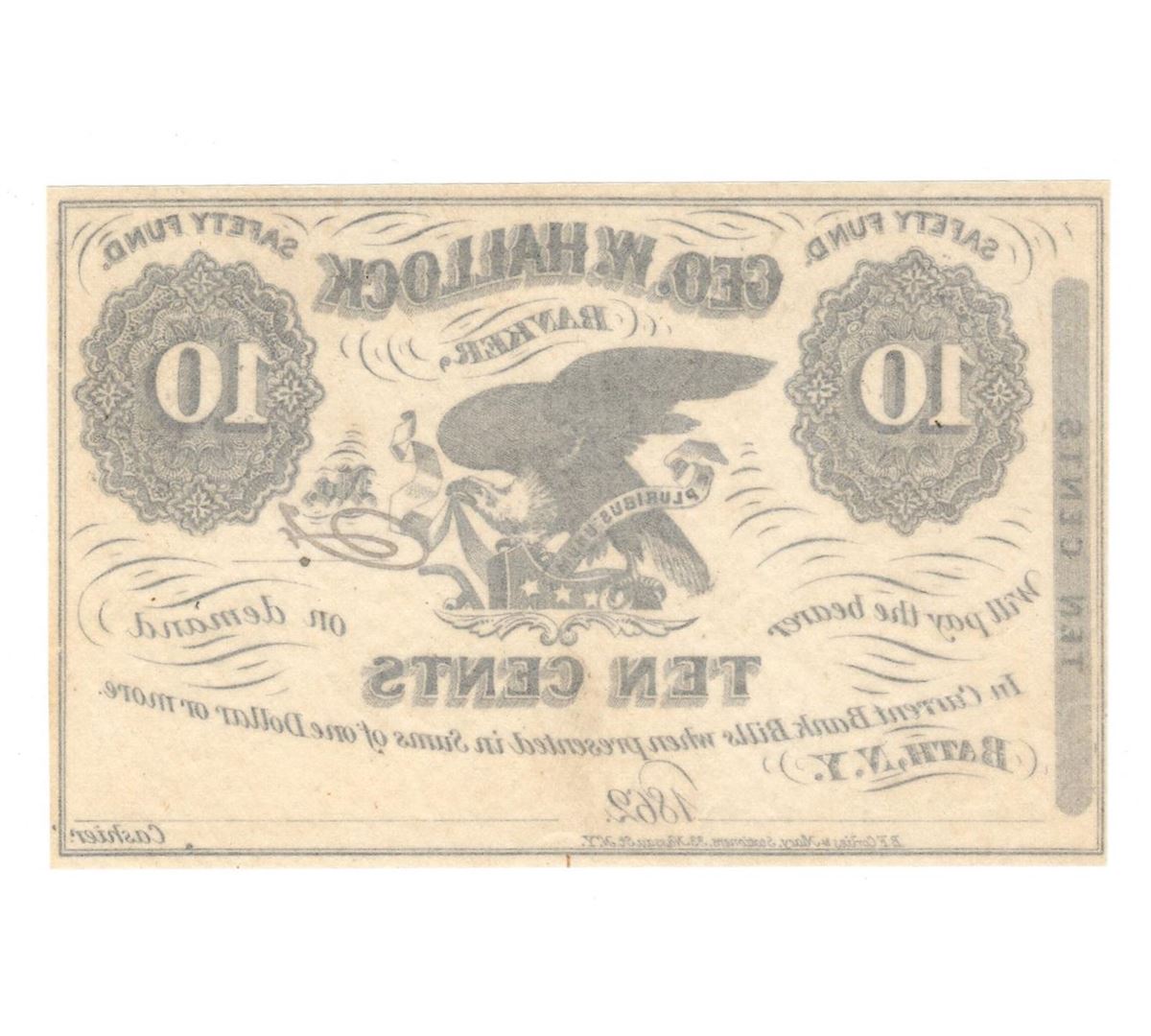 One 1862 10 Cents Geo W. Hallock Banker Safety Fund Obsolete Note.