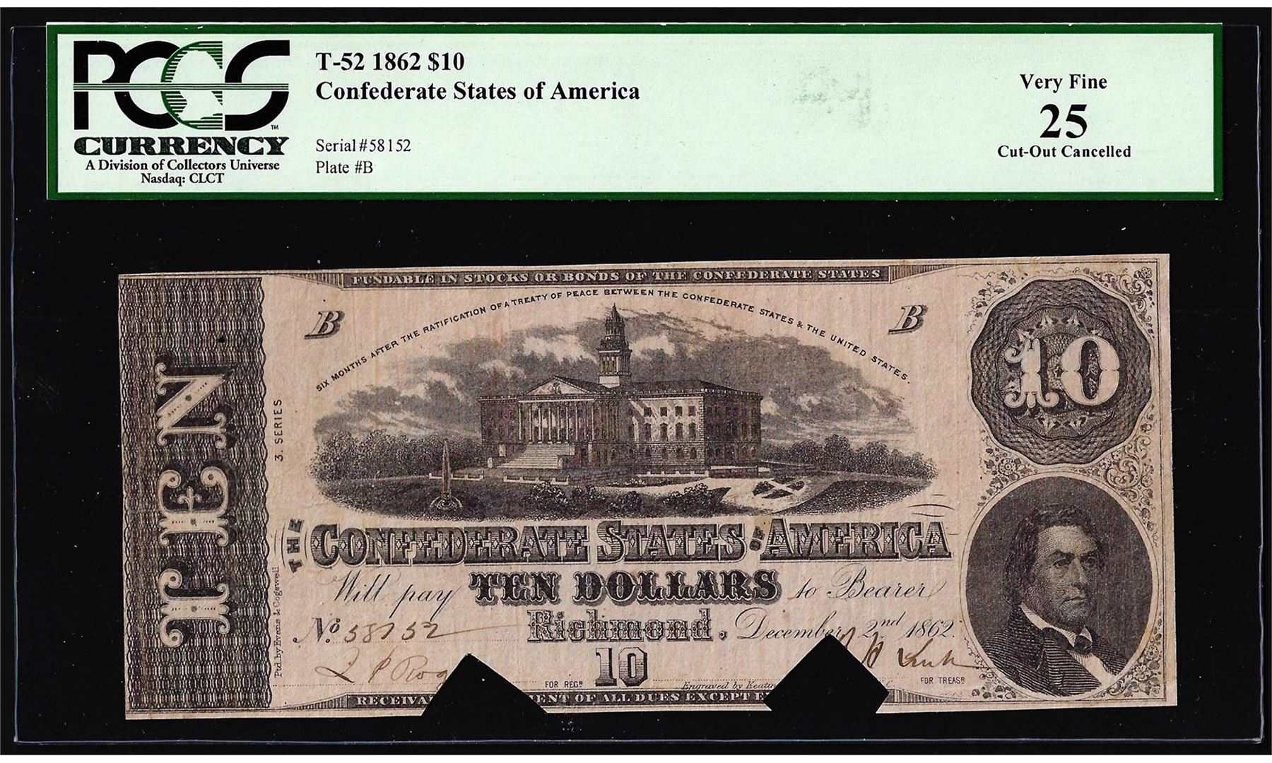1862 $10 Confederate States of America Note T-52 PCGS Very Fine 25 Cut Canceled