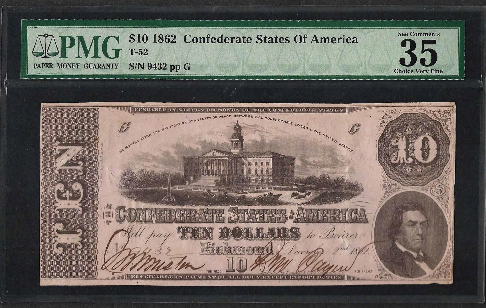 One 1862 $10 Confederate States of America Note T-52 PMG Choice Very Fine 35. PMG Certified.