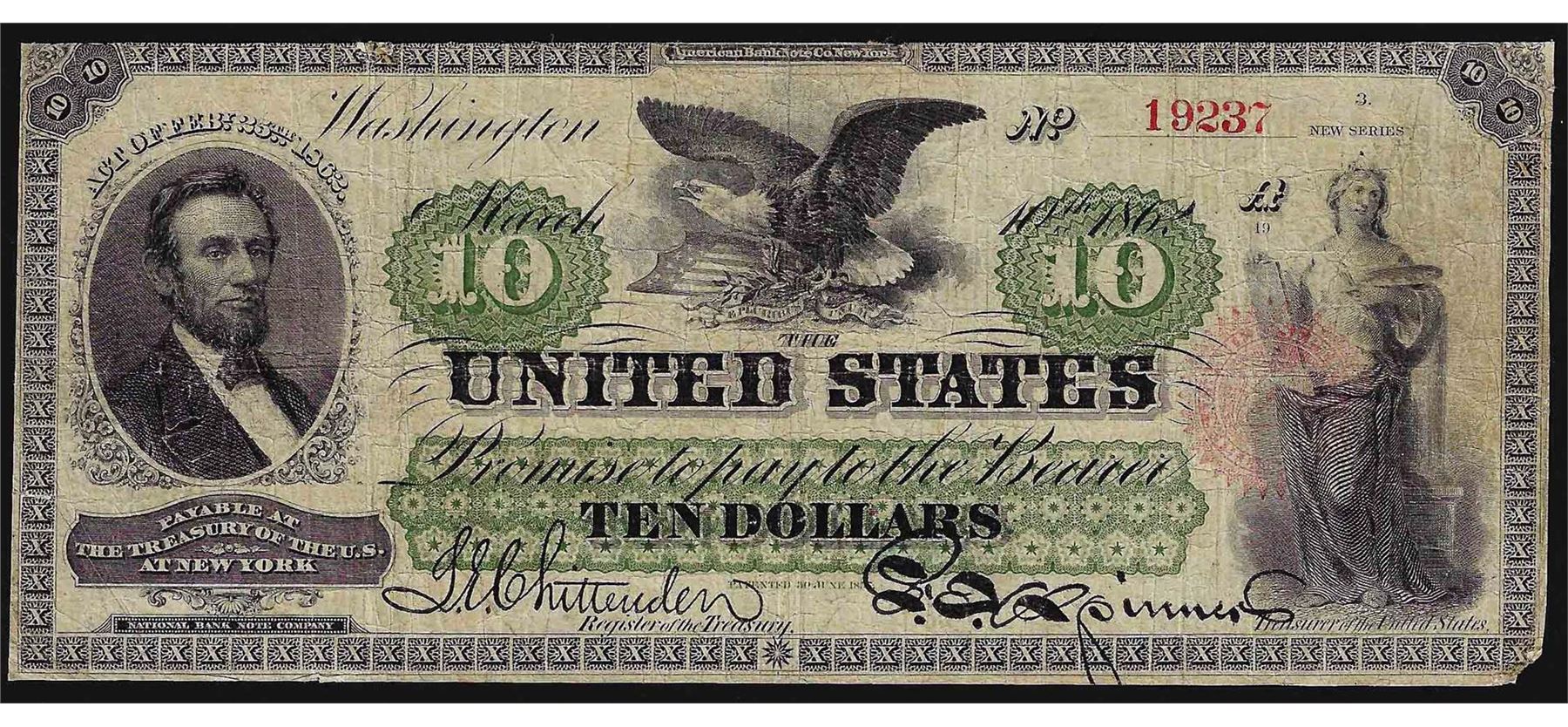 One 1862 $10 Legal Tender Note.