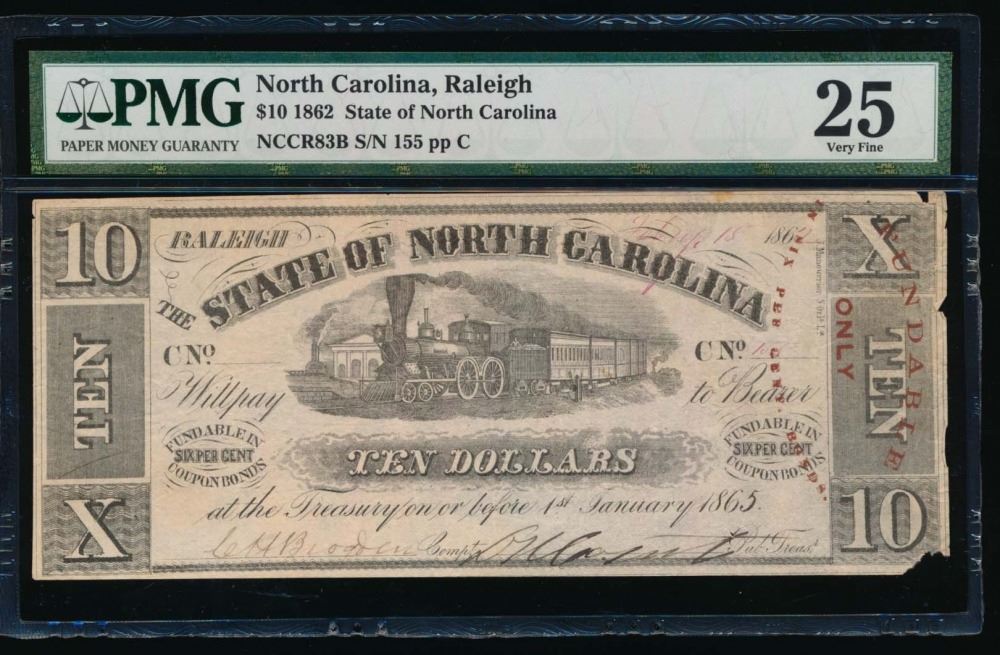 One 1862 $10 Raleigh NC Obsolete Note PMG 25.