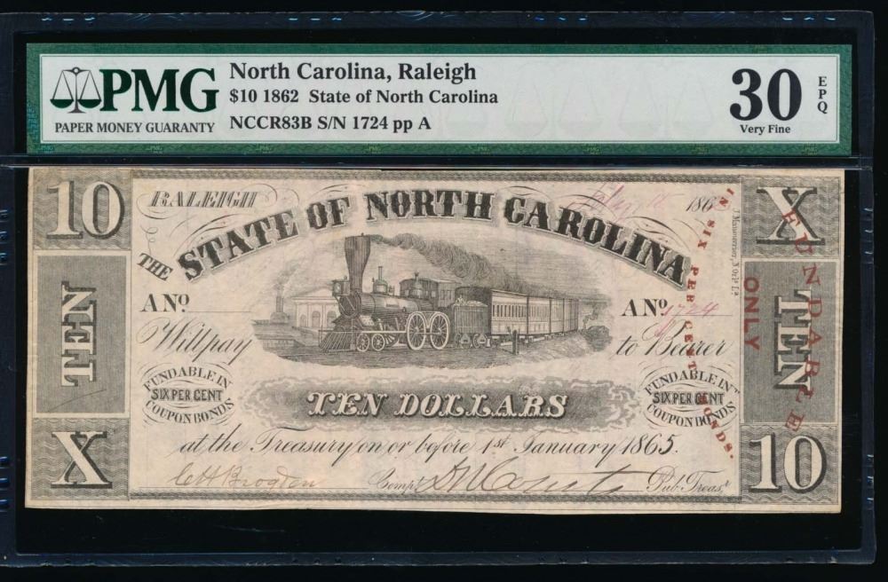 One 1862 $10 Raleigh NC Obsolete Note PMG 30EPQ.