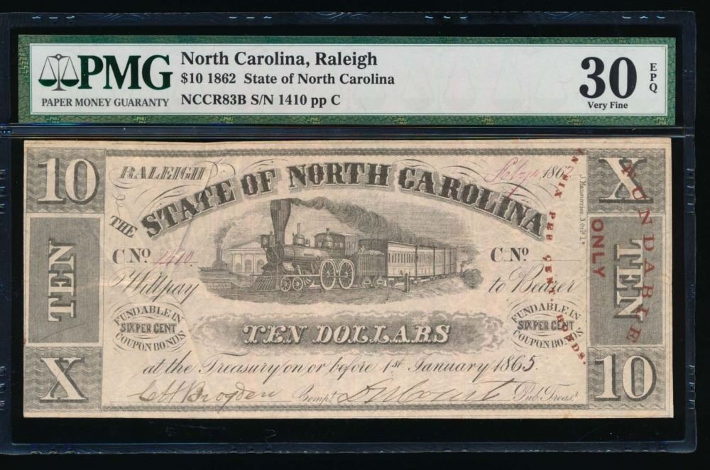 One 1862 $10 Raleigh NC Obsolete Note PMG 30EPQ.