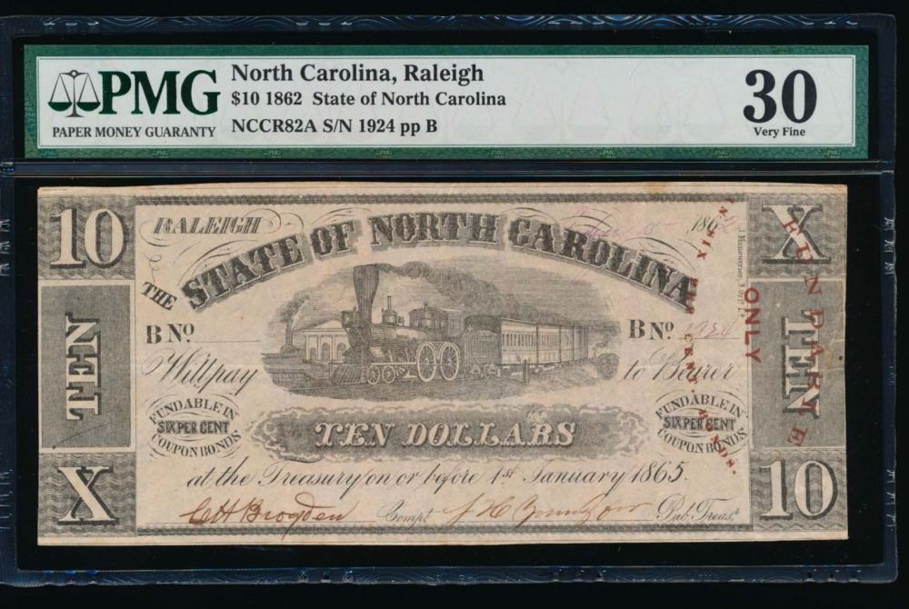 One 1862 $10 Raleigh NC Obsolete Note PMG 30.