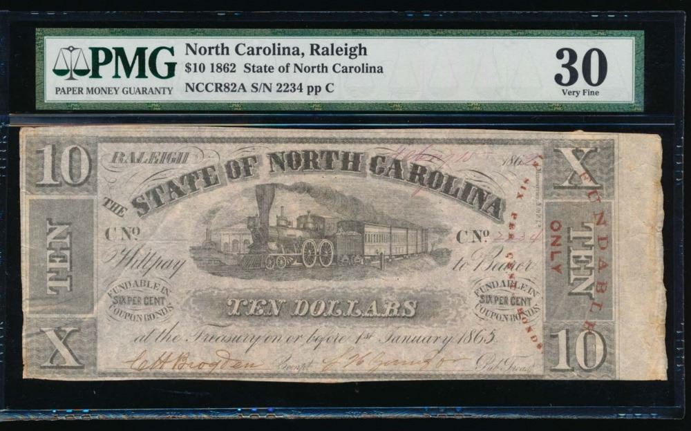 One 1862 $10 Raleigh NC Obsolete Note PMG 30.
