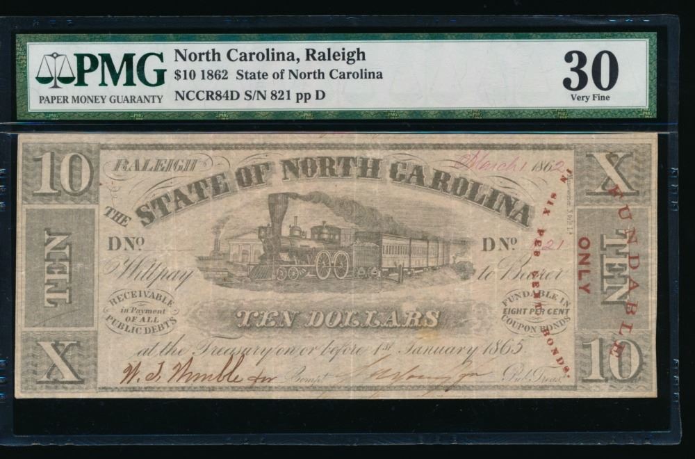 One 1862 $10 Raleigh NC Obsolete Note PMG 30.