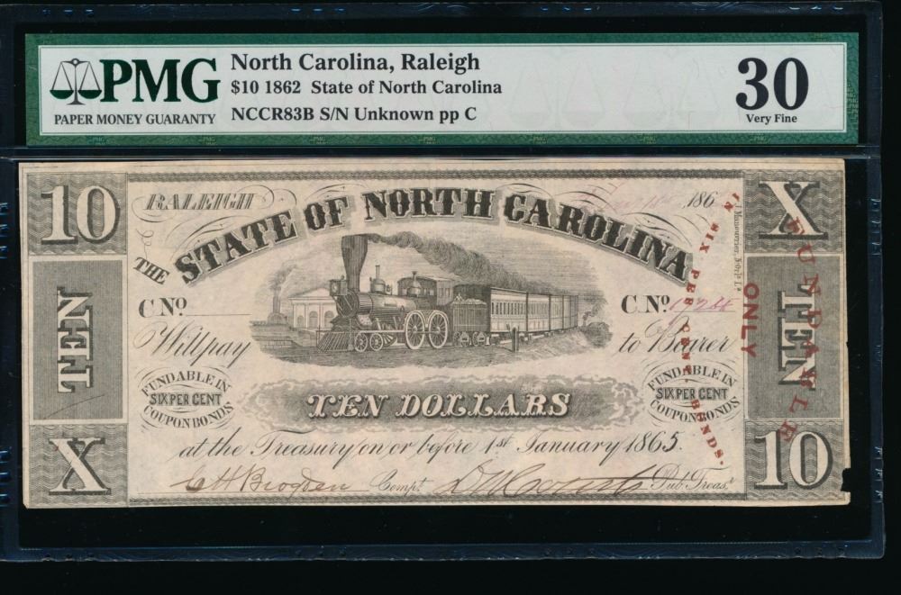 One 1862 $10 Raleigh NC Obsolete Note PMG 30.