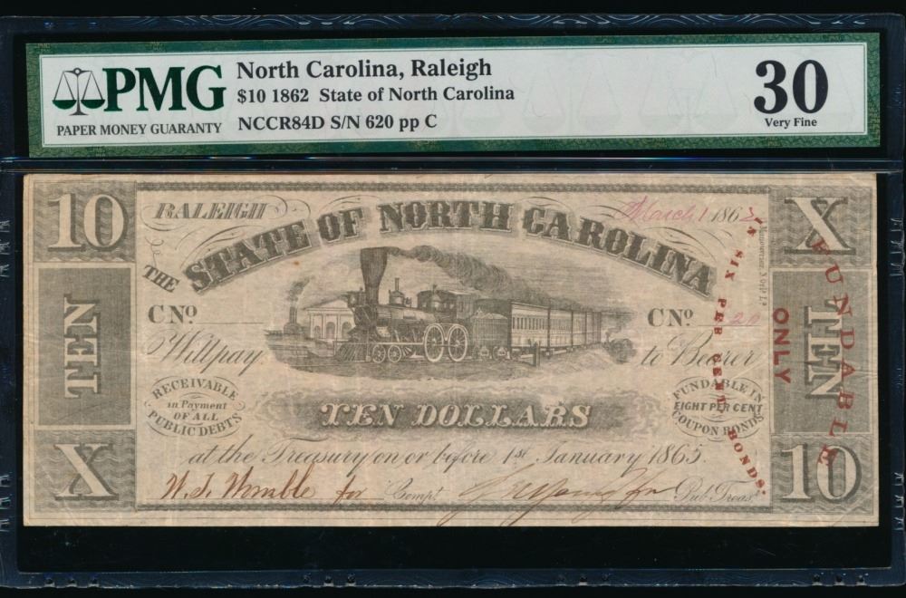 One 1862 $10 Raleigh NC Obsolete Note PMG 30.