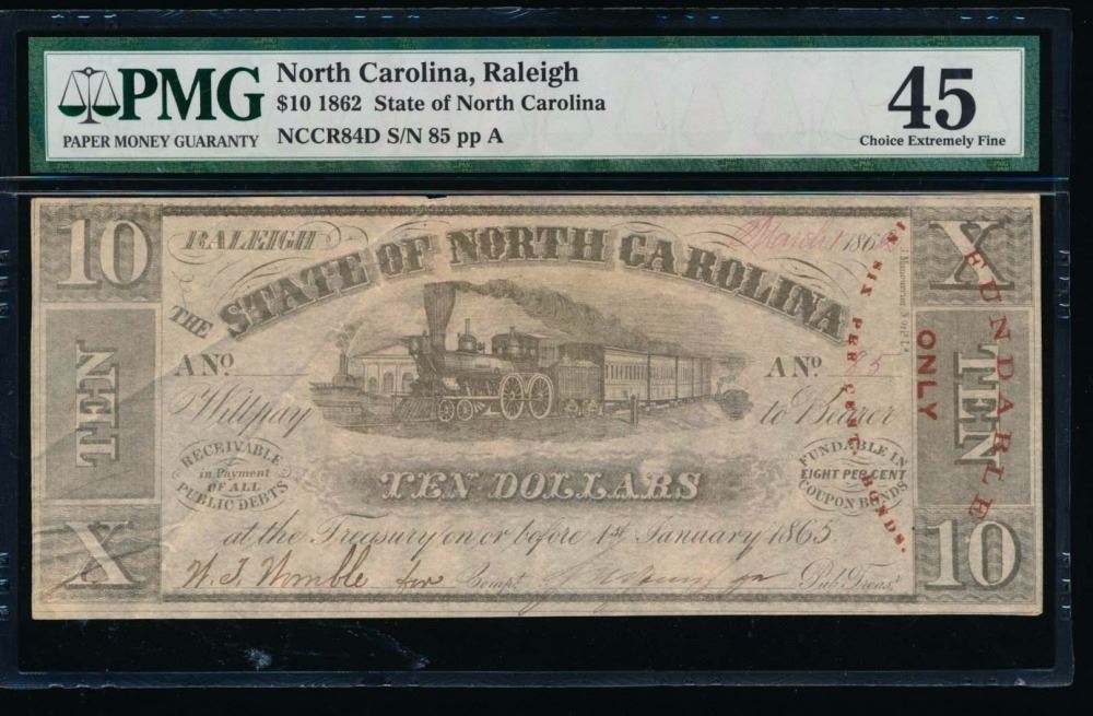 One 1862 $10 Raleigh NC Obsolete Note PMG 45.