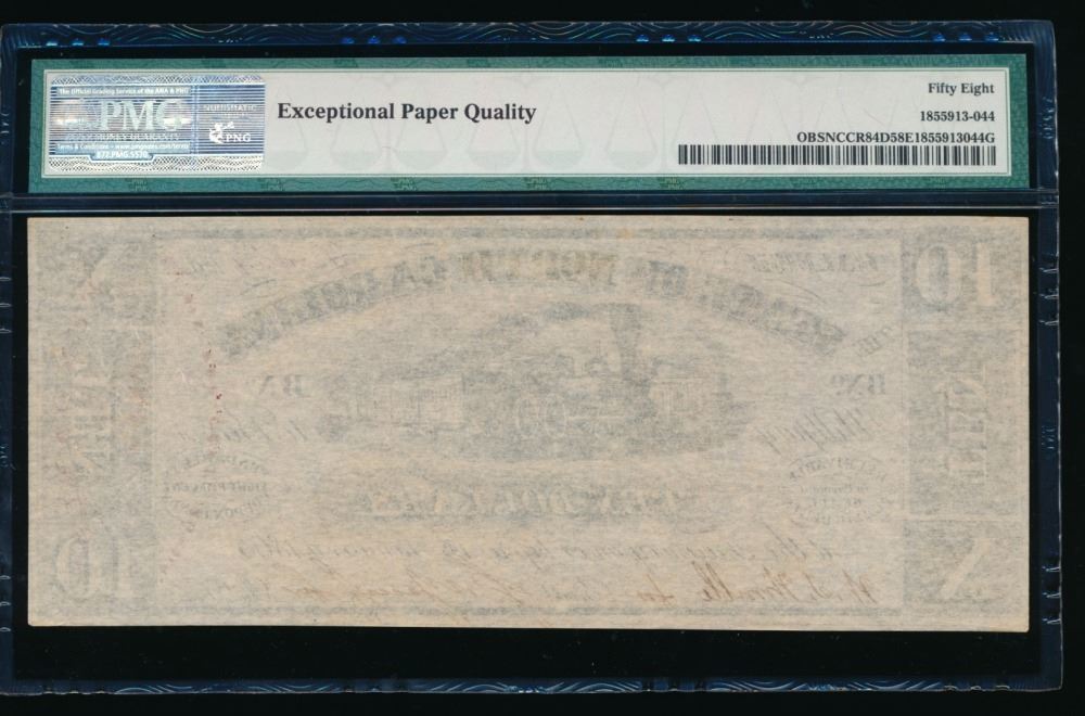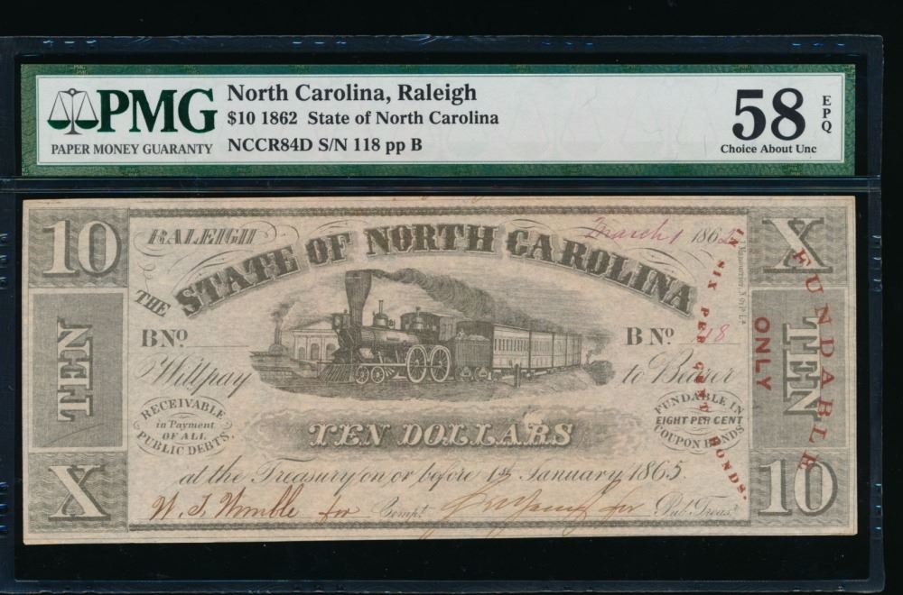 One 1862 $10 Raleigh NC Obsolete Note PMG 58EPQ.