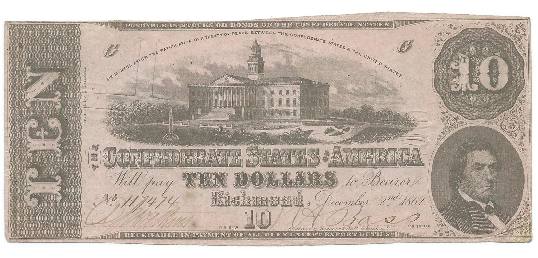 One 1862 $10 The Confederate States of America Note T-52 CC