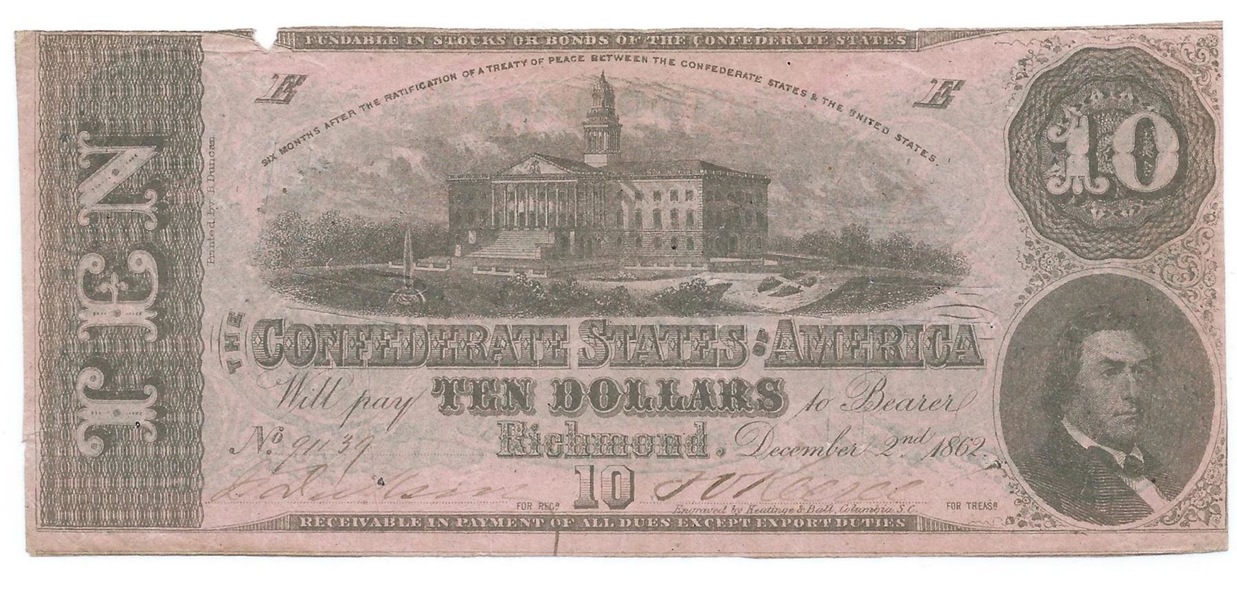 One 1862 $10 The Confederate States of America Note T-52 CC