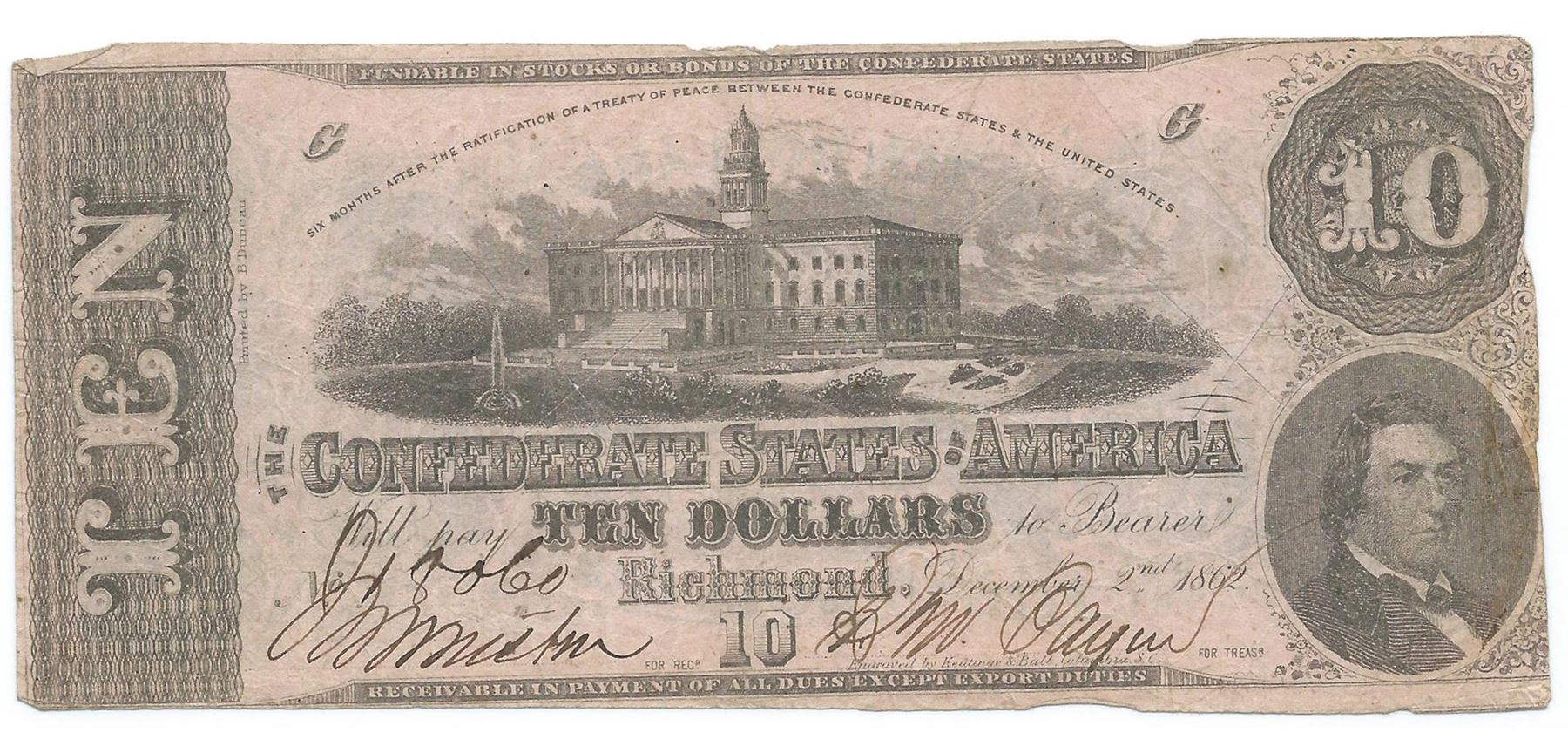 One 1862 $10 The Confederate States of America Note T-52 CC