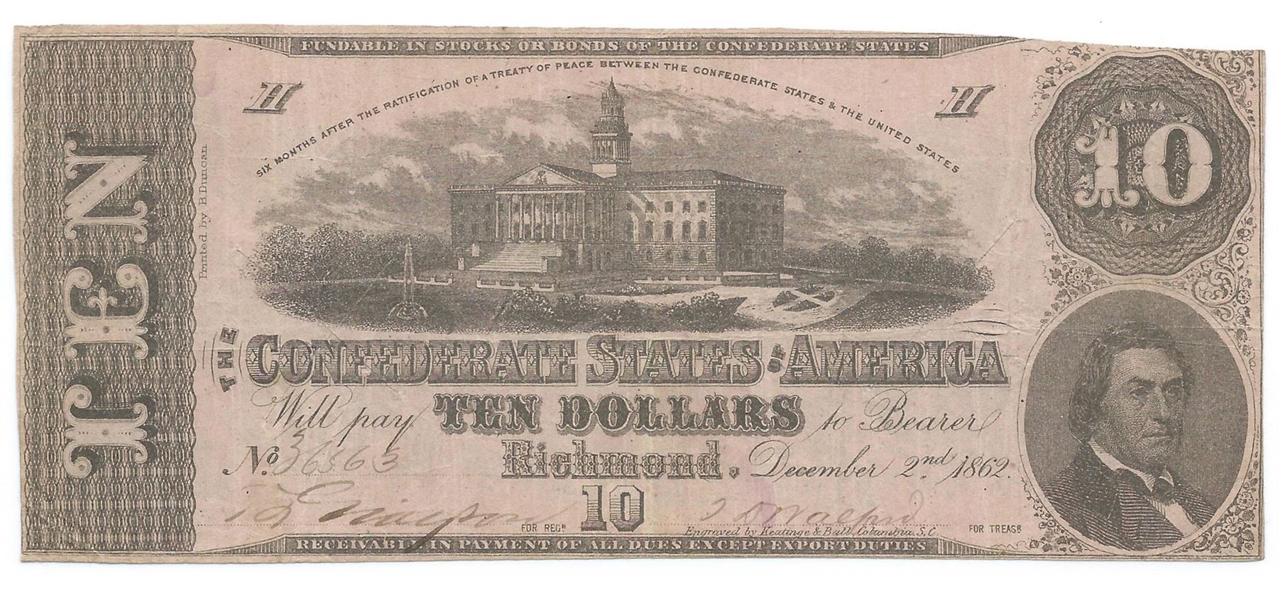 One 1862 $10 The Confederate States of America Note T-52 CC